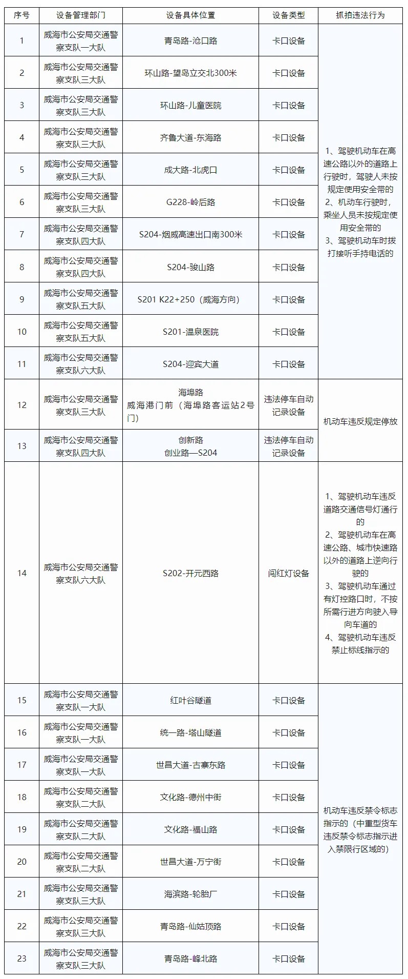 為保障道路交通安全,預(yù)防和減少交通事故的發(fā)生,根據(jù)《中華人民共和國道路交通安全法》及其實(shí)施條例等法律法規(guī)和相關(guān)技術(shù)規(guī)范的規(guī)定,依據(jù)《公安機(jī)關(guān)執(zhí)法公開規(guī)定》,現(xiàn)將新增的23處交通技術(shù)監(jiān)控設(shè)備予以公示,自2024年12月1日起,將對(duì)有關(guān)交通違法行為進(jìn)行依法管理,請(qǐng)廣大道路交通參與者自覺遵守相關(guān)法律法規(guī),共同維護(hù)良好的道路交通秩序。