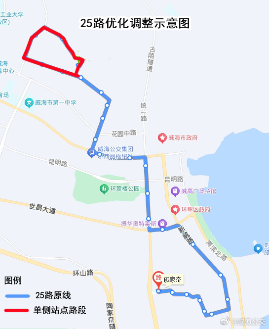 威高花園樞紐站改為途經(jīng)站,調(diào)整后,25路改為戚家夼環(huán)行運(yùn)行,由戚家夼發(fā)車,按原線運(yùn)行至威高時光城站點(diǎn)后,改行宮松嶺路、遠(yuǎn)遙墩路、臥龍山路、宮松嶺路按原線路返回戚家夼站點(diǎn)。威高花園區(qū)域站點(diǎn)調(diào)整為單側(cè)???。