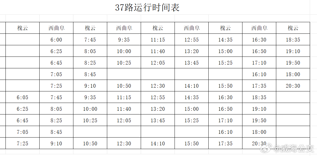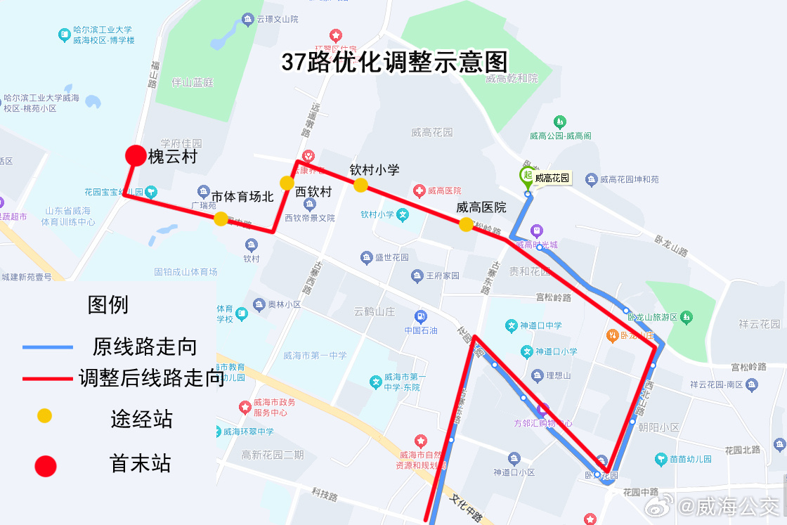 調(diào)整后,37路由西曲阜發(fā)車,按原線路運(yùn)行至威高時光城站點(diǎn),改行宮松嶺路、遠(yuǎn)遙墩路、花園中路、福山路至槐云村站點(diǎn),取消威高花園1個站點(diǎn),增設(shè)威高醫(yī)院、欽村小學(xué)、西欽村、體育場北、槐云村5個站點(diǎn)。