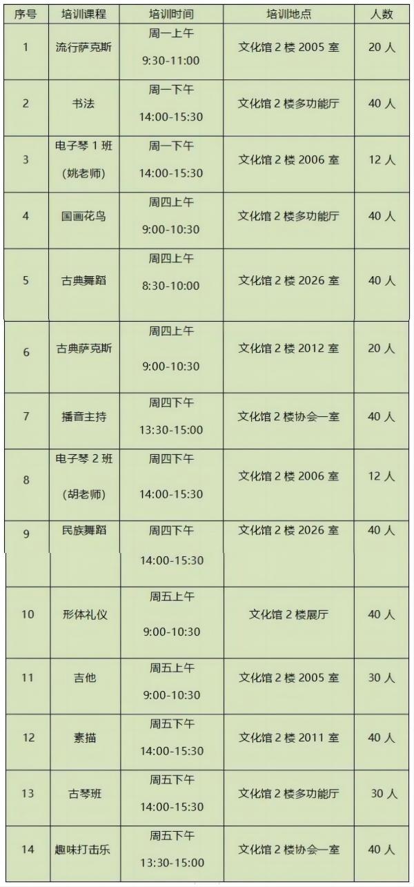 1、國畫(40人)、2、書法(40人)、3、素描(40人)、4、趣味打擊樂(40人)、5、民族舞蹈(40人)、6、古典舞蹈(40人)、7、電子琴1班(12人)、8、電子琴2班(12人)、9、流行薩克斯(20人)、10、古典薩克斯(20人)、11、古琴班(30人)、12、吉他(30人)、13、播音主持(40人)、14、形體禮儀(40人)等。每個(gè)專業(yè)12期講座,14個(gè)專業(yè)共計(jì)168場講座。