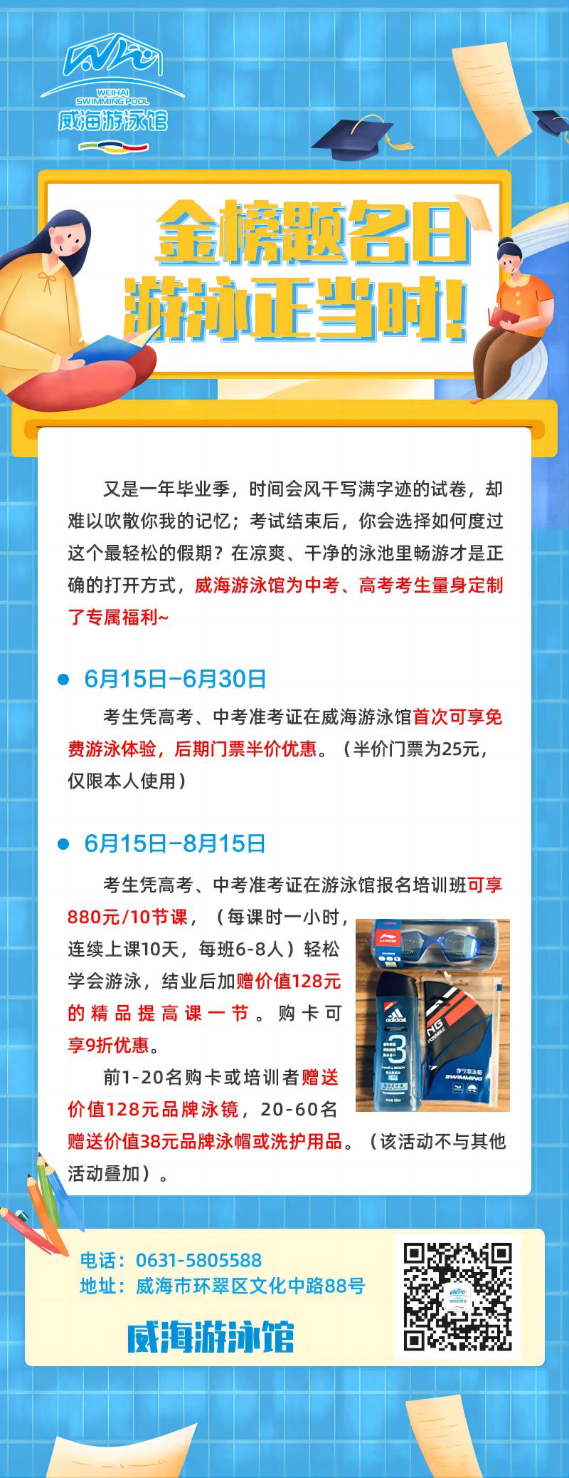 6月15日-6月30日考生憑高考、中考準(zhǔn)考證在威海游泳館首次可享免費(fèi)游泳體驗,后期門票半價優(yōu)惠。(半價門票為25元僅限本人使用)