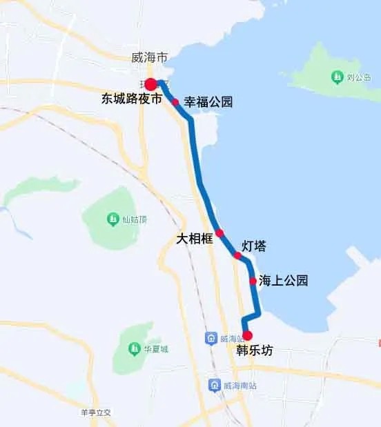線路由東城路夜市發(fā)車,途經大相框(市人社局東)、燈塔、海上公園(慶威花園)、韓樂坊東(經區(qū)中國銀行)、韓樂坊(紅星美凱龍)、海上公園(慶威花園)、燈塔、大相框(市人社局東)、幸福公園后返回東城路夜市。