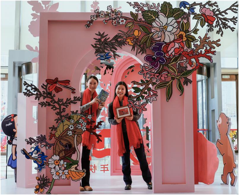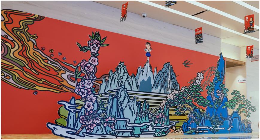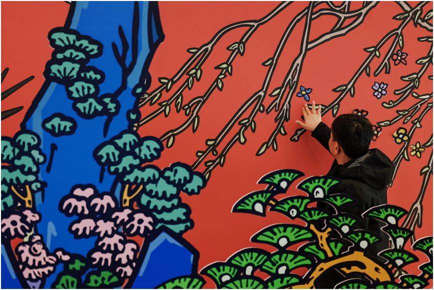 互動(dòng)區(qū)——“送你一朵小紅花” “送你一朵小紅花”互動(dòng)裝置打造了卜樺作品《春風(fēng)拂面》中太陽(yáng)灑下溫暖光芒、祥云飄逸靈動(dòng)、柳樹(shù)輕拂微風(fēng)、山峰屹立巍峨的自然仙境,構(gòu)建出極具沉浸感的互動(dòng)場(chǎng)景。市民朋友可以在花朵貼紙上寫下對(duì)生活、對(duì)未來(lái)的美好愿望,并將其貼于背景墻上,用愛(ài)與期待編織希望的篇章。